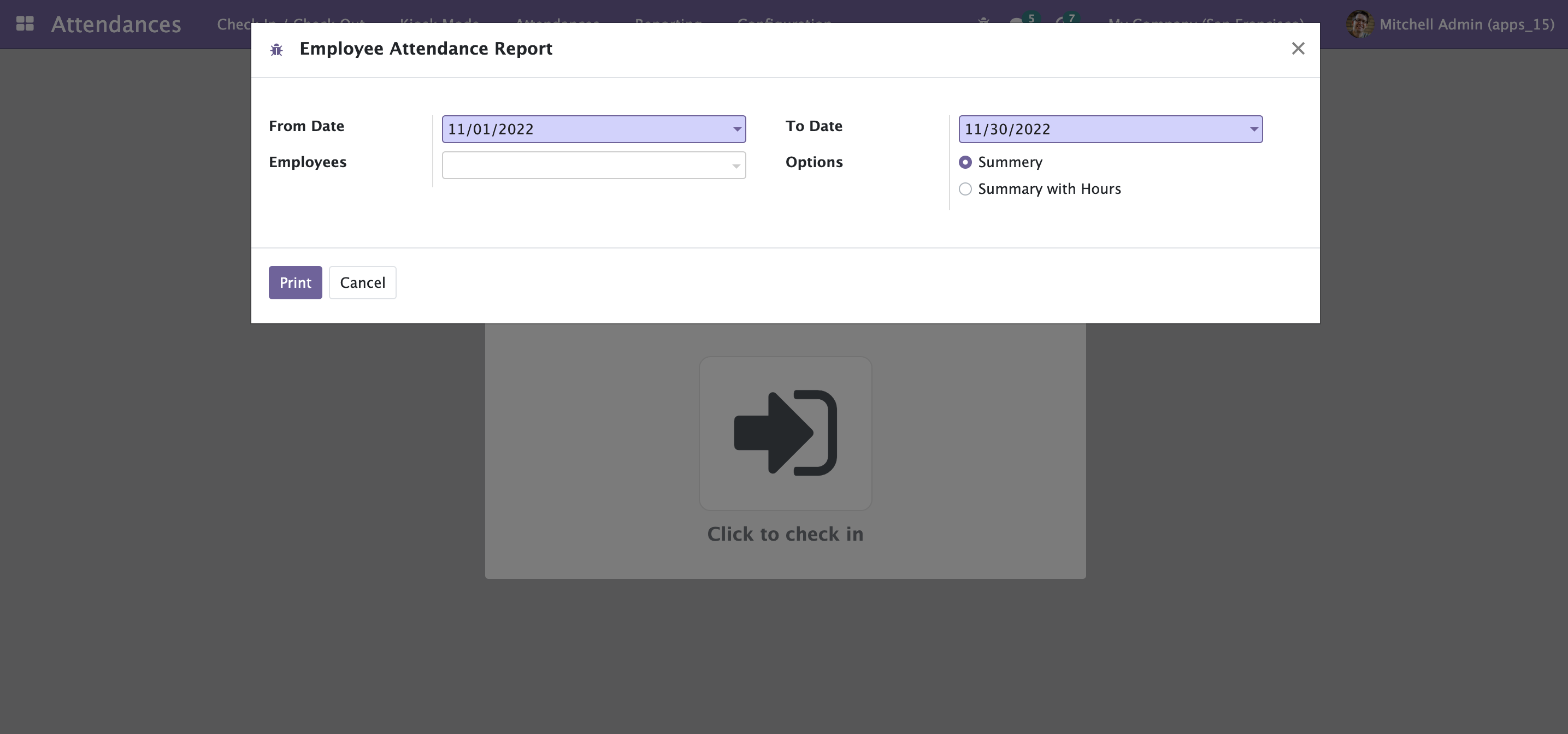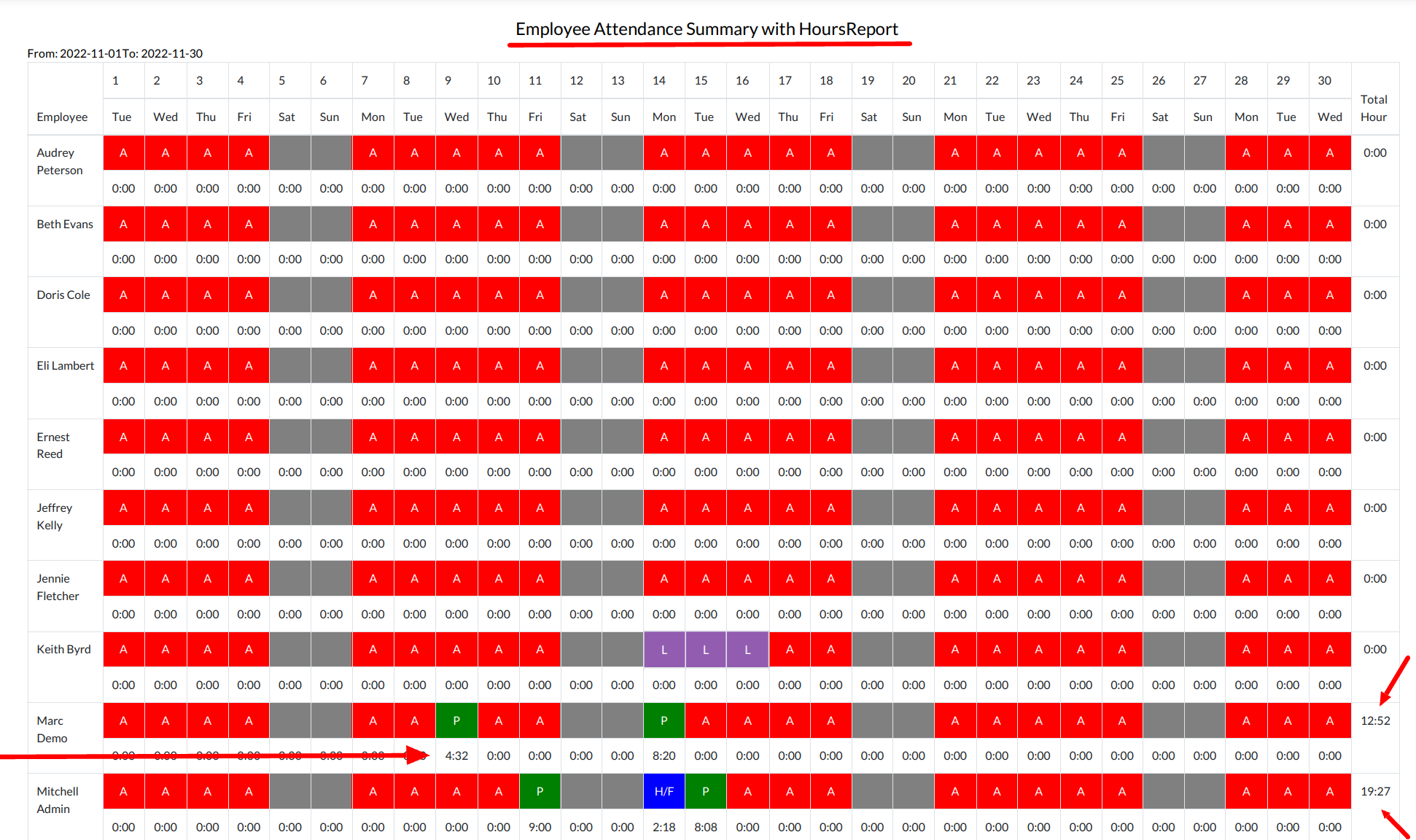 - Employee Attendance Report includes status summery line ( A - Absent, P - Present, H/F - Half Day, L - Leave) as well as with hours Summery (Attendance Hours of that day).