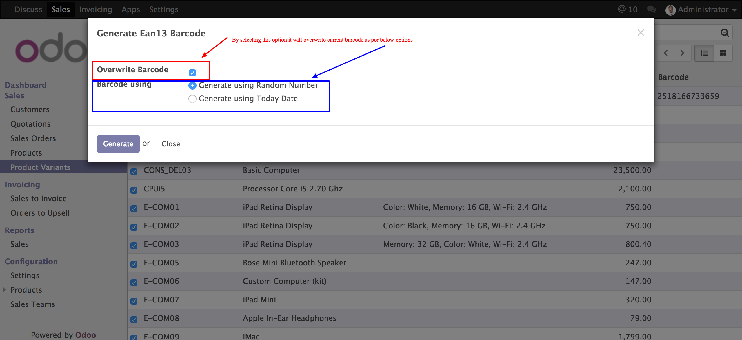 >> Select "Barcode using" and "Overwrite Barcode" and click on Generate button. if you need to Overwrite Barcode then only Select "Overwrite Barcode" it will change barcode as per you select from this wizard
