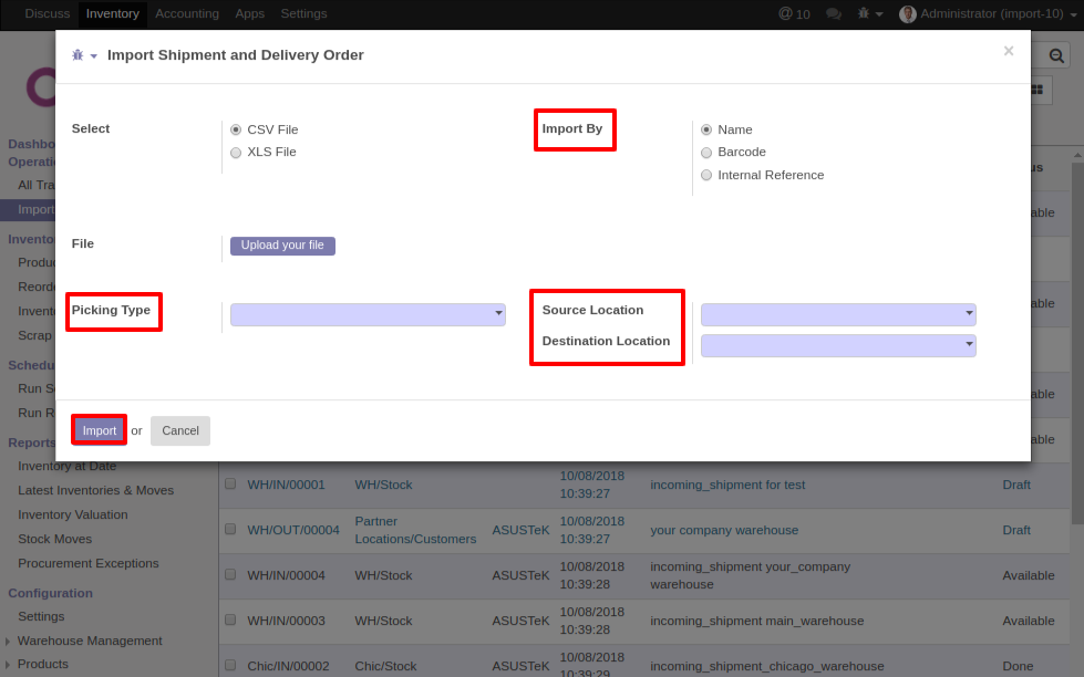 - Importing Shipment/Delivery/Internal Transfer using CSV/XLS