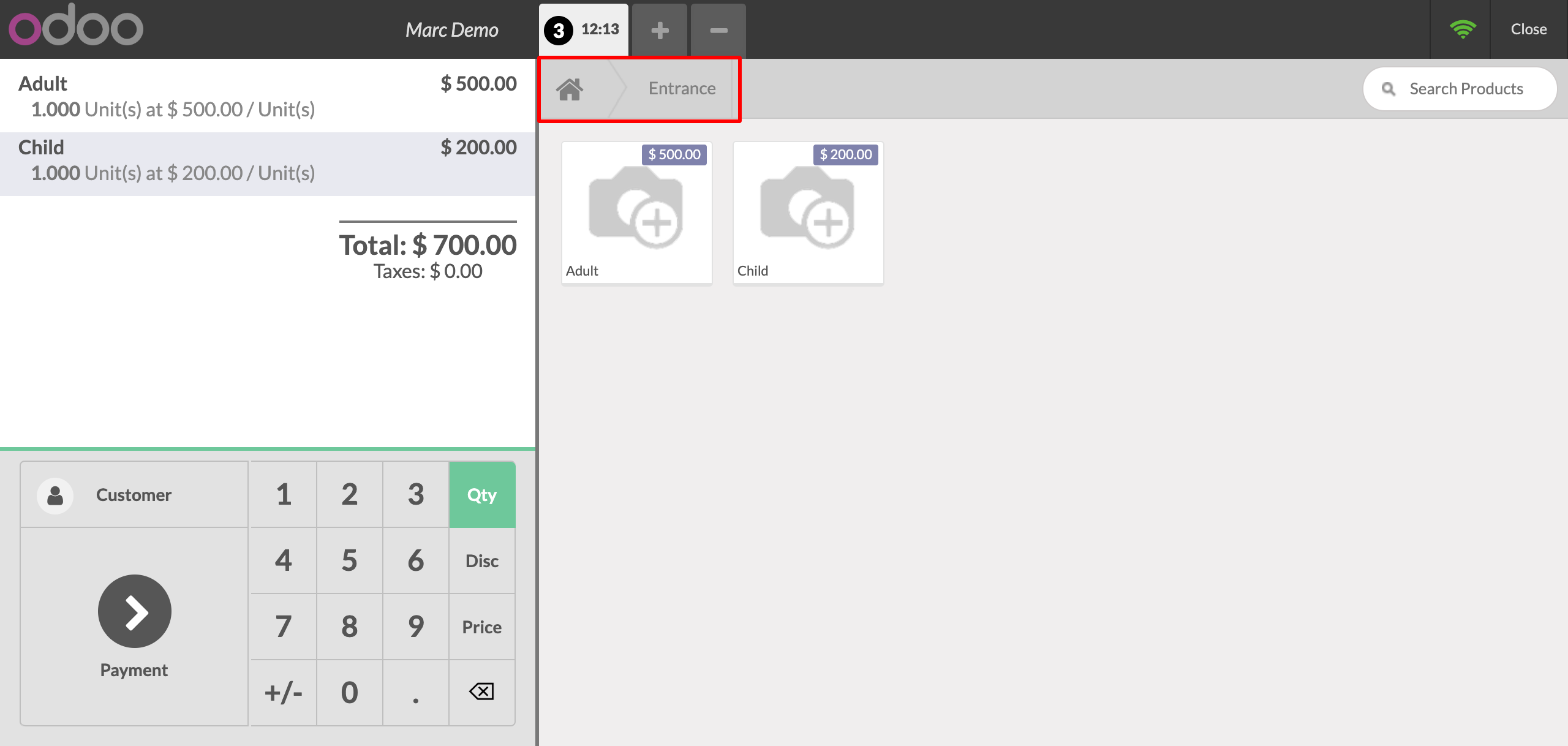 In Point Of Sale Screen Session Type with Entrance shows all product of selected category.