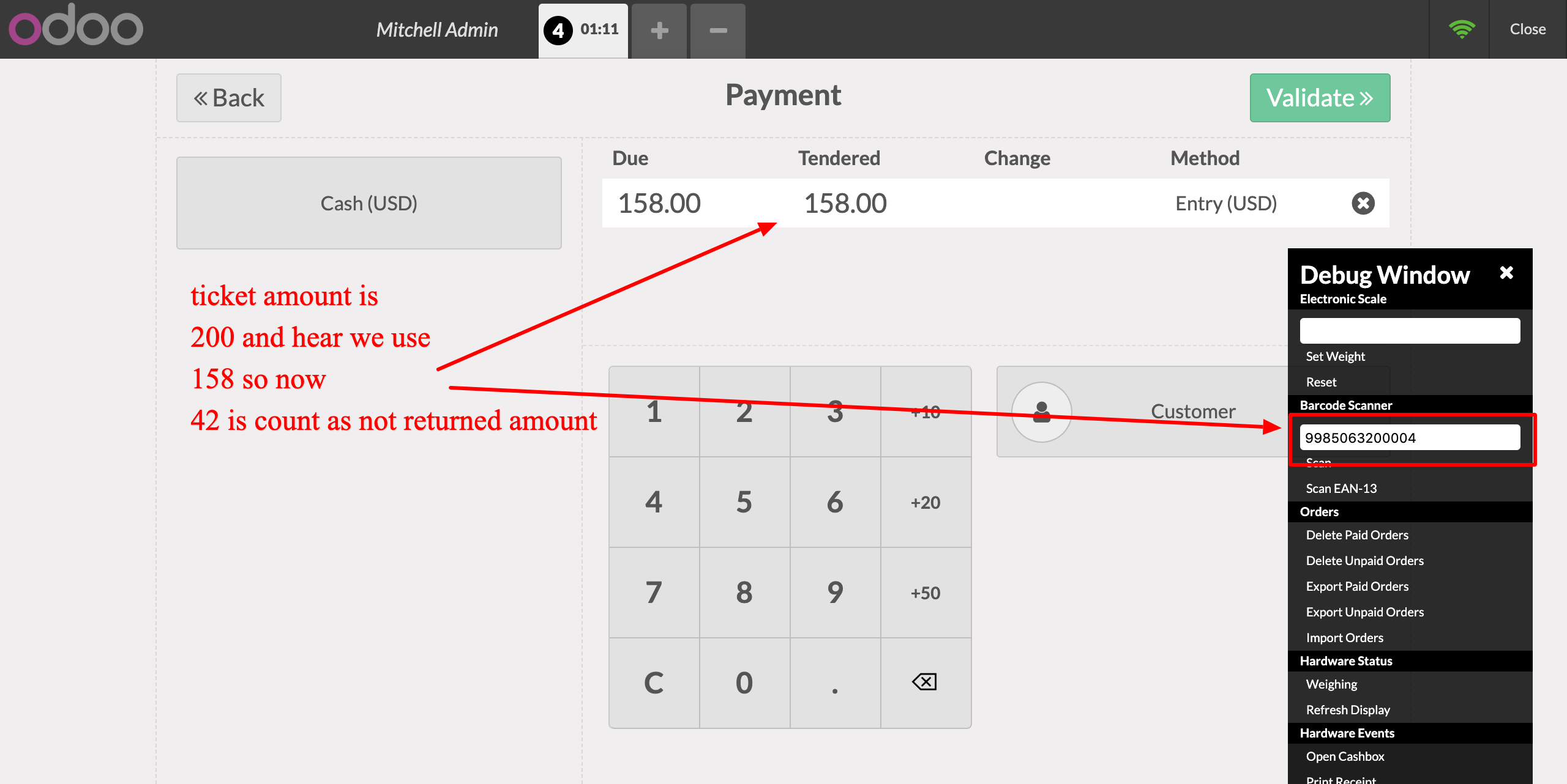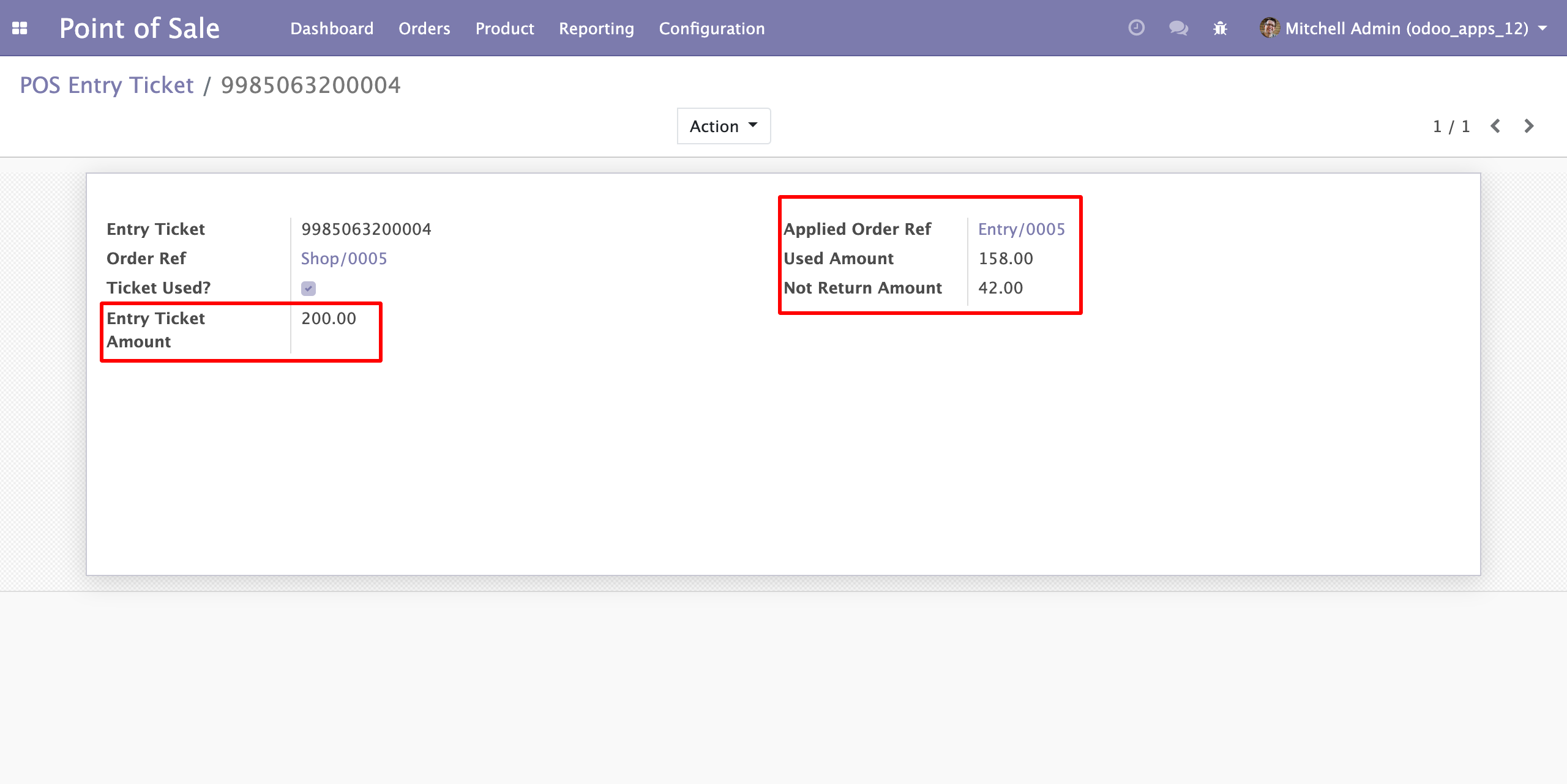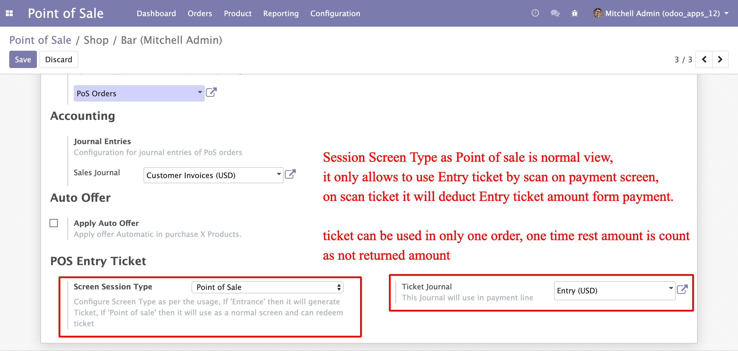 - Screen Session Type with "Point of sale" we can scan Entry Ticket with Ticket bar code and the amount will affect as per Ticket value.