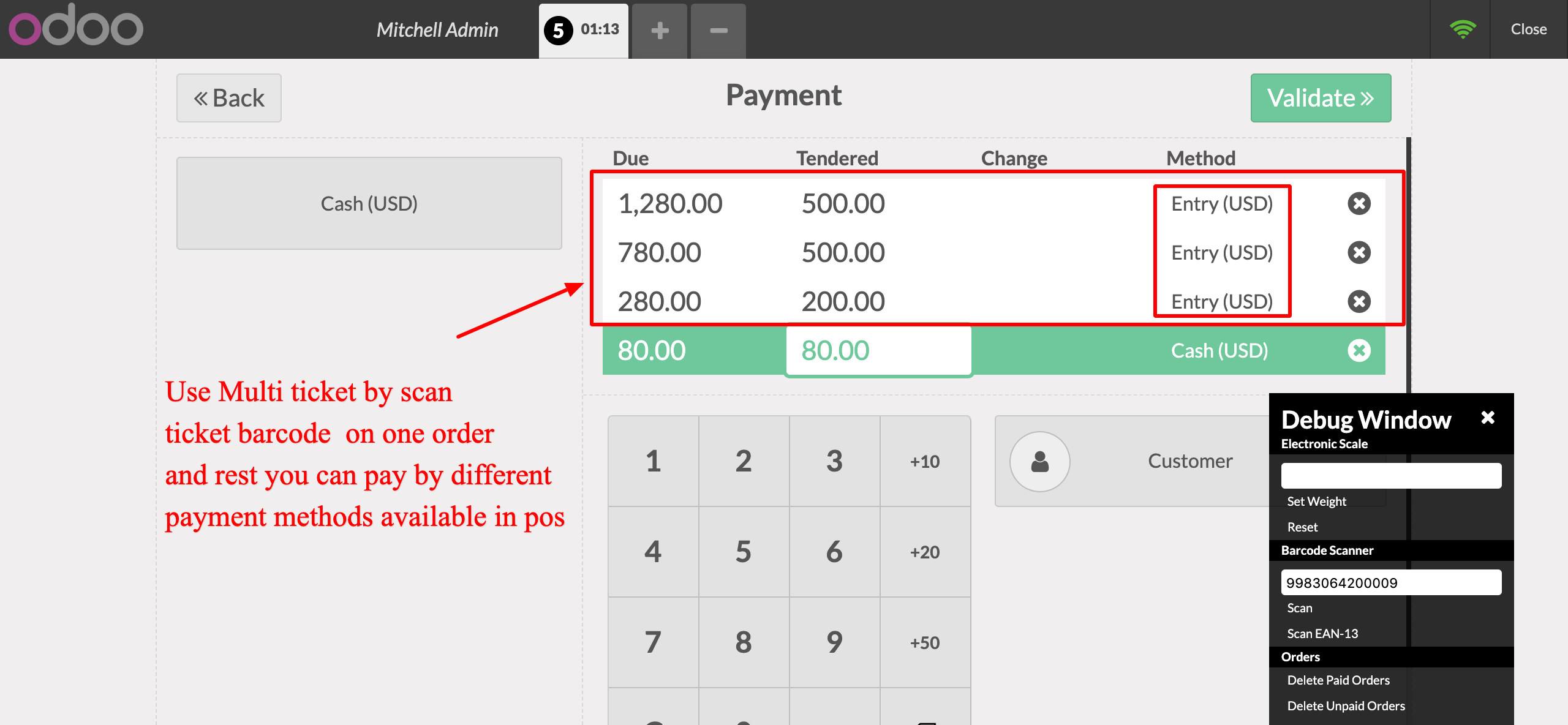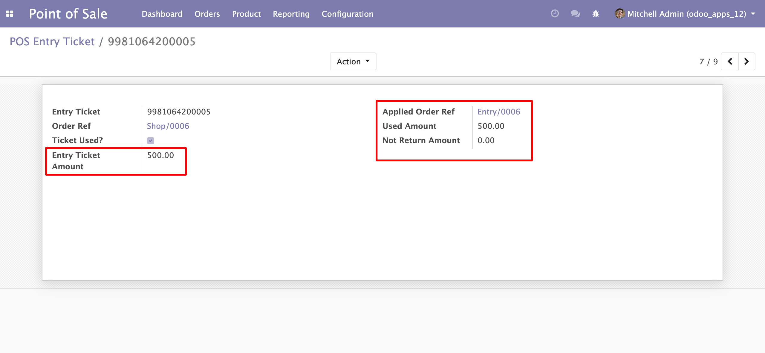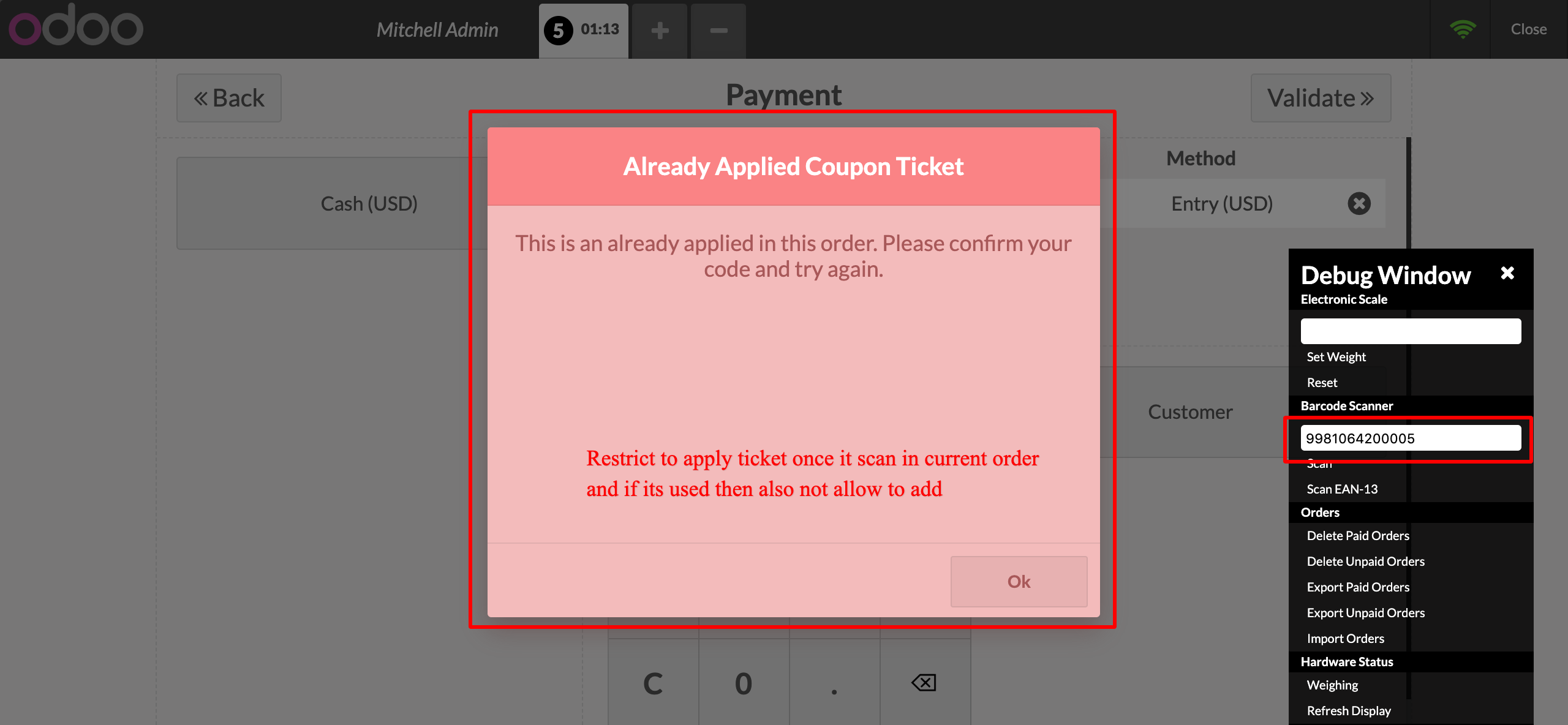 - Screen Session Type with "Point of sale" we can scan Entry Ticket with Ticket bar code and the amount will affect as per Ticket value.