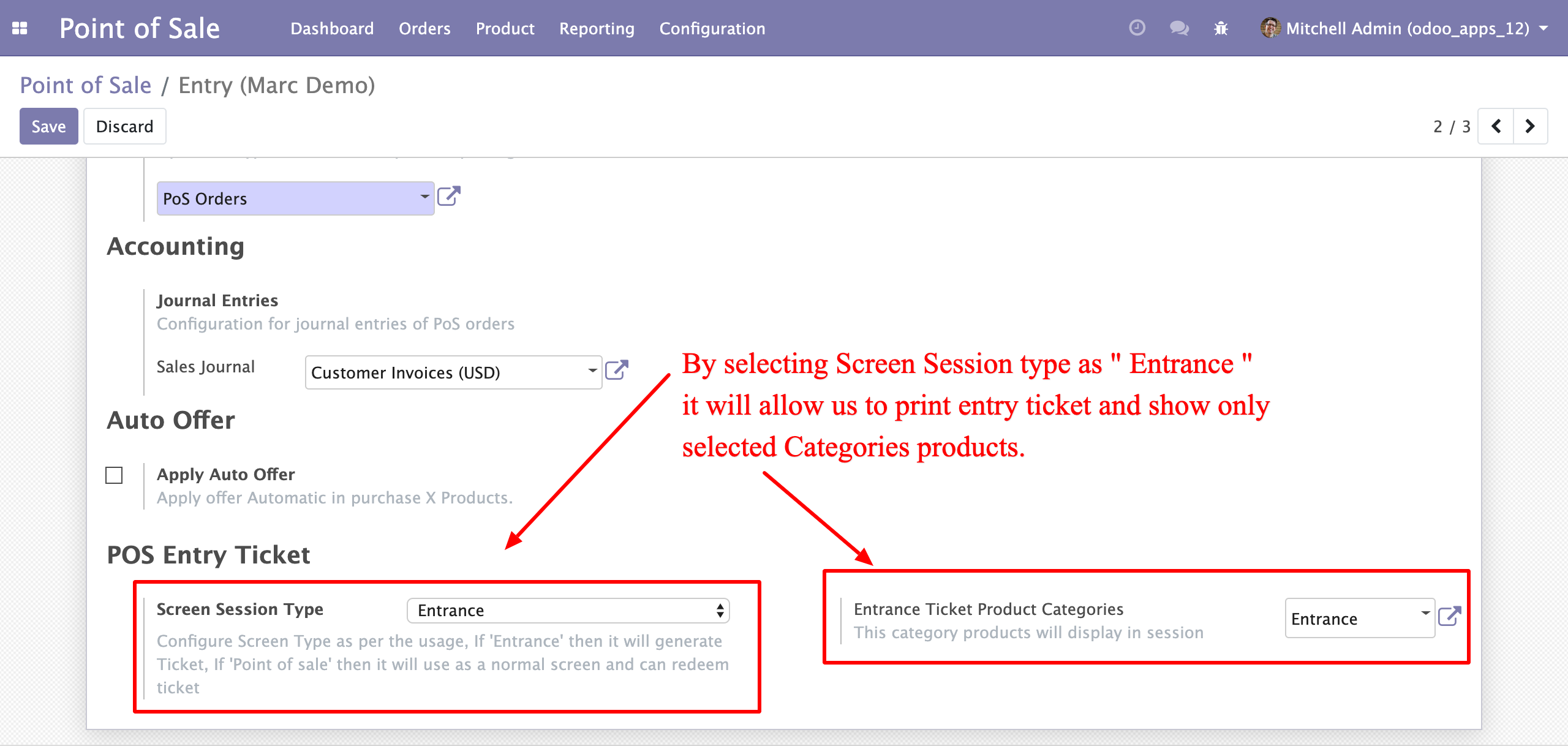 II. Select Screen Session Type Entrance & Entrance Ticket Product Categories to filter product at Entrance screen.