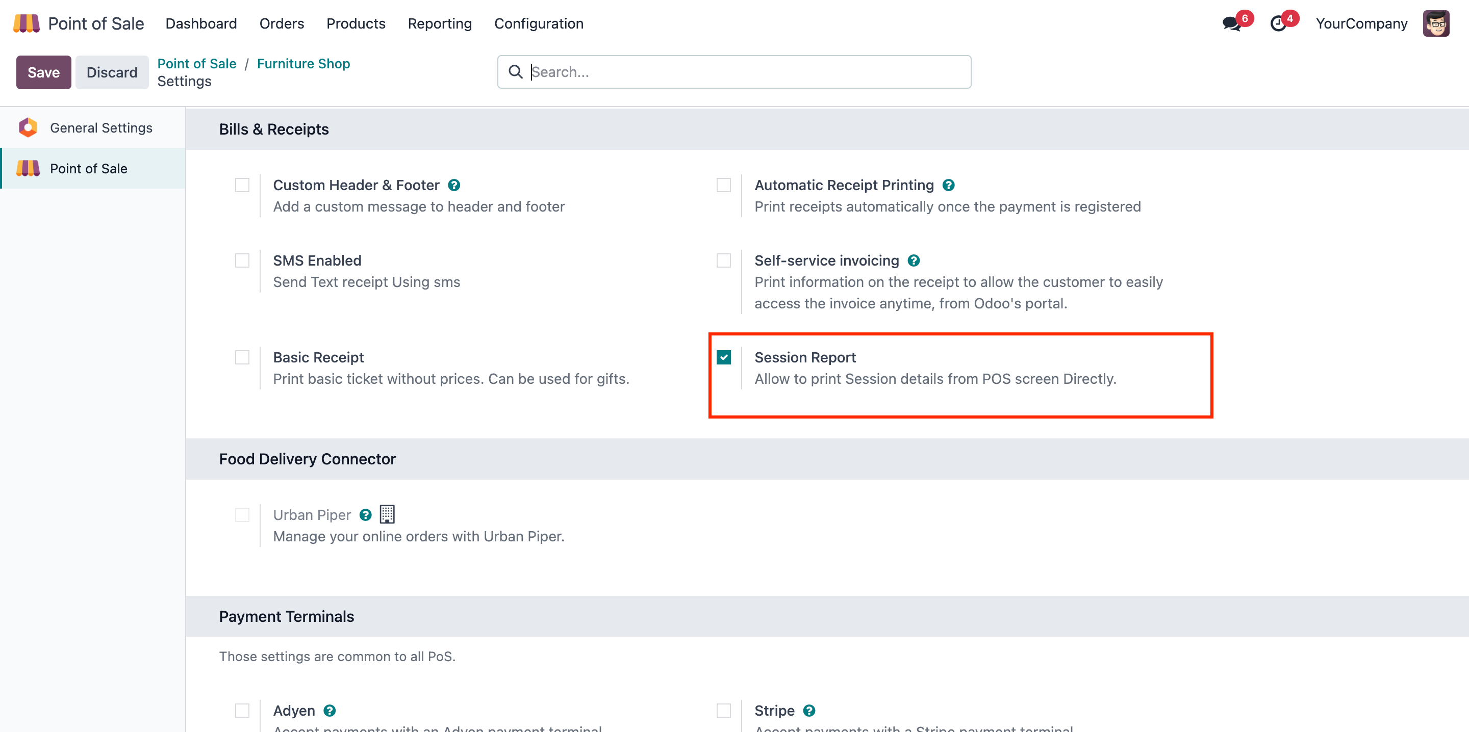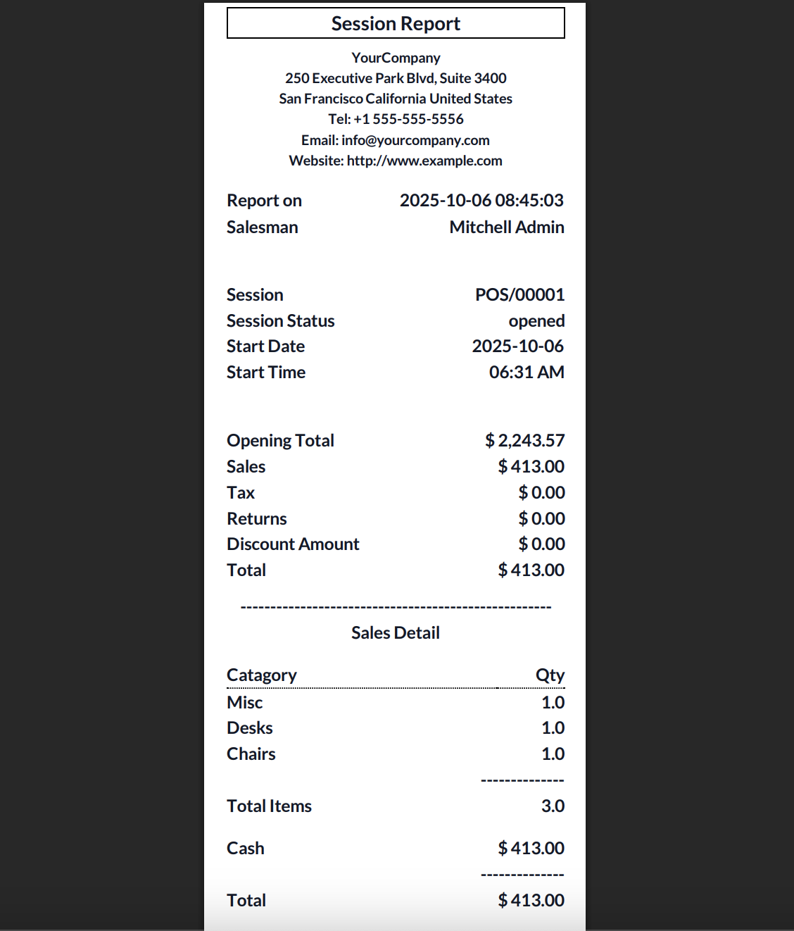 - Using this module salesman can directly check the report of current session with opening balance, total sale, tax collect, discounts, return , total item sale and payment detail.