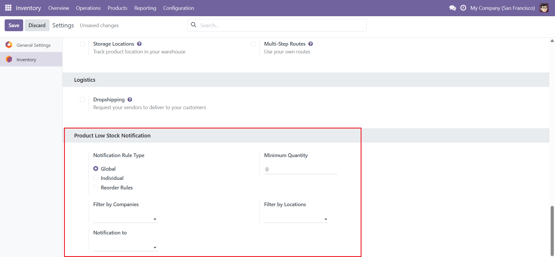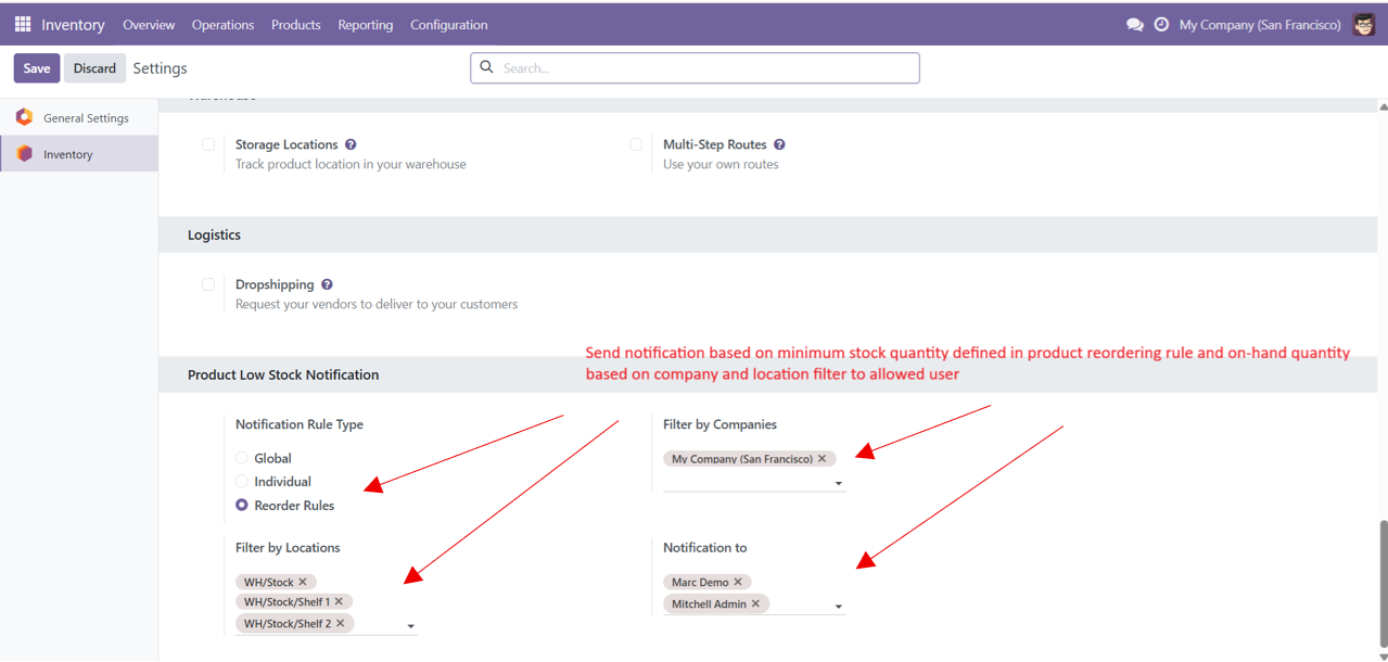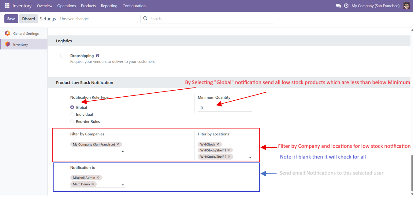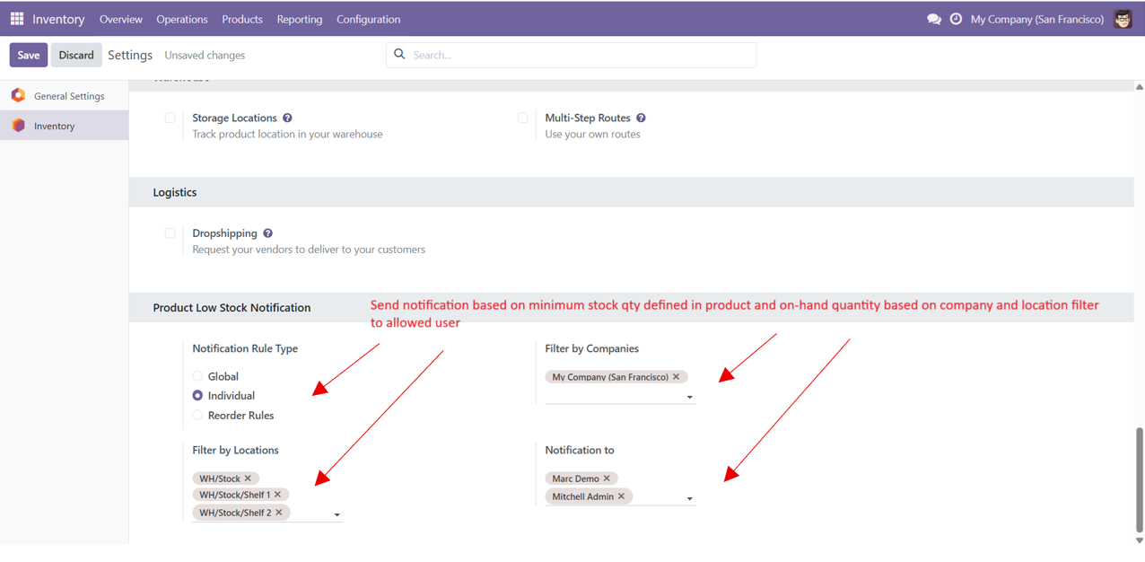 - Product Low stock notification based on different types (Global, Individual and Reordering Rules).