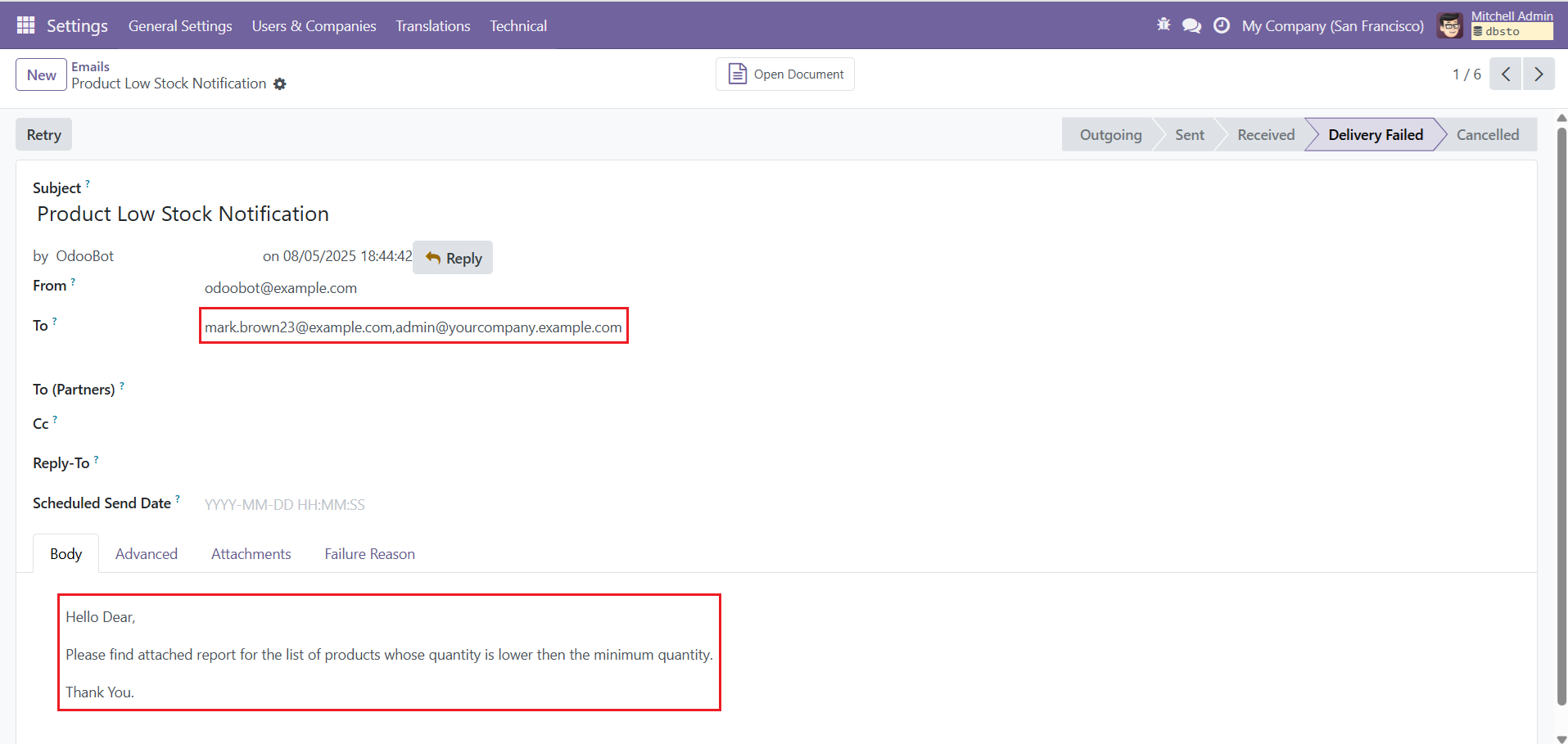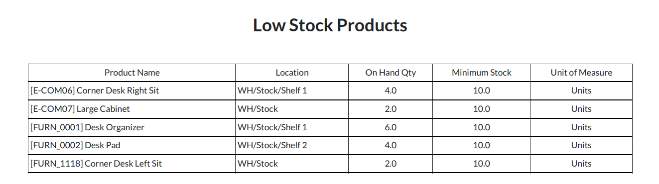 - Get detail of low stock products via email and can filter by Company and Location.