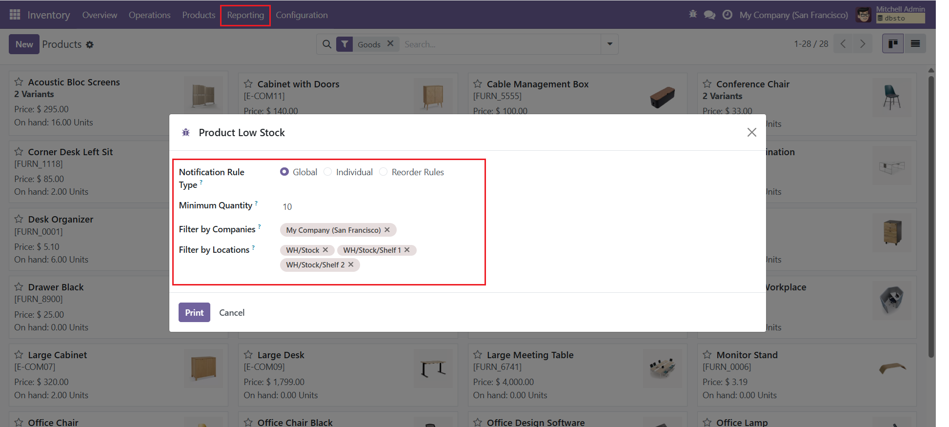 - Print Low Stock Report directly using company and location filter.