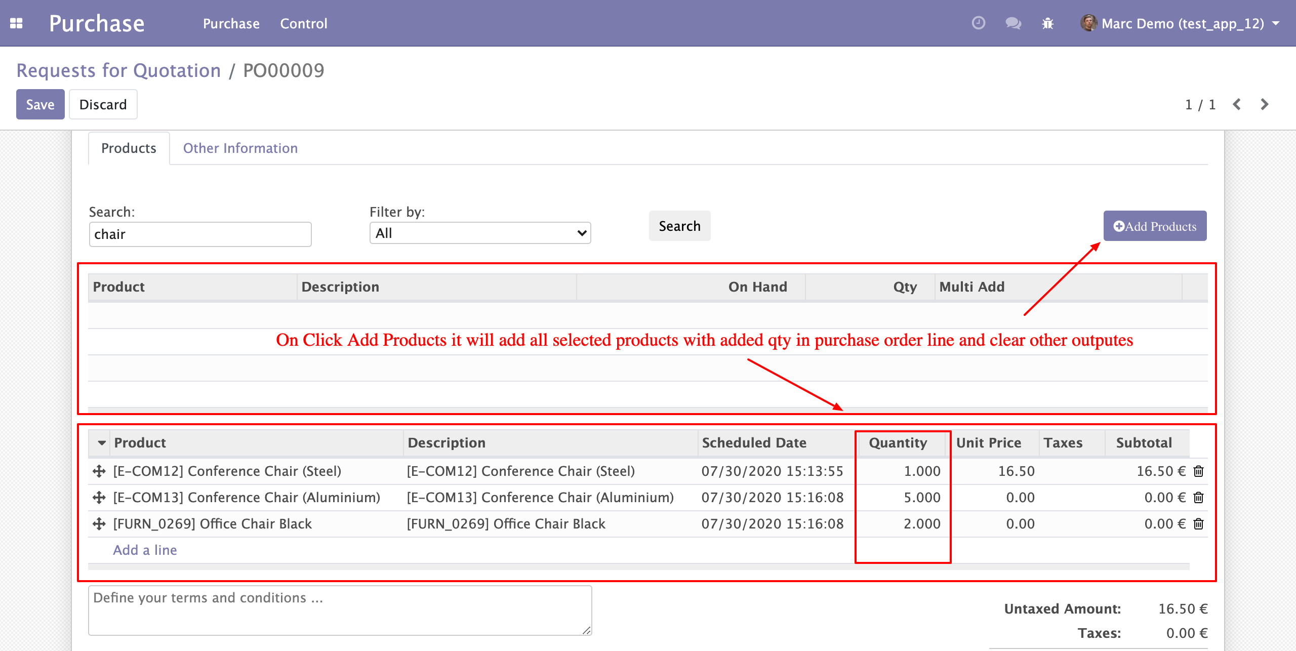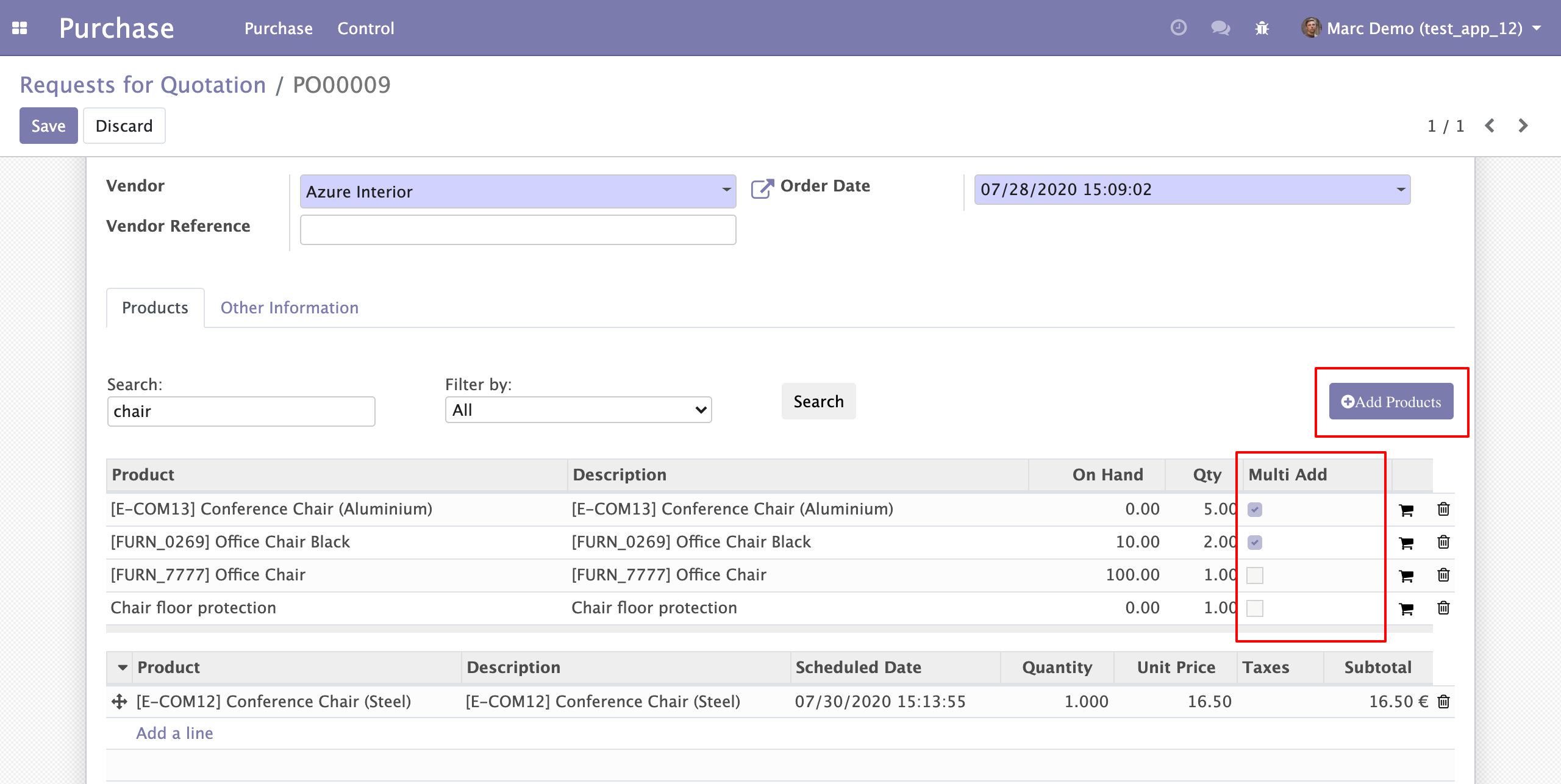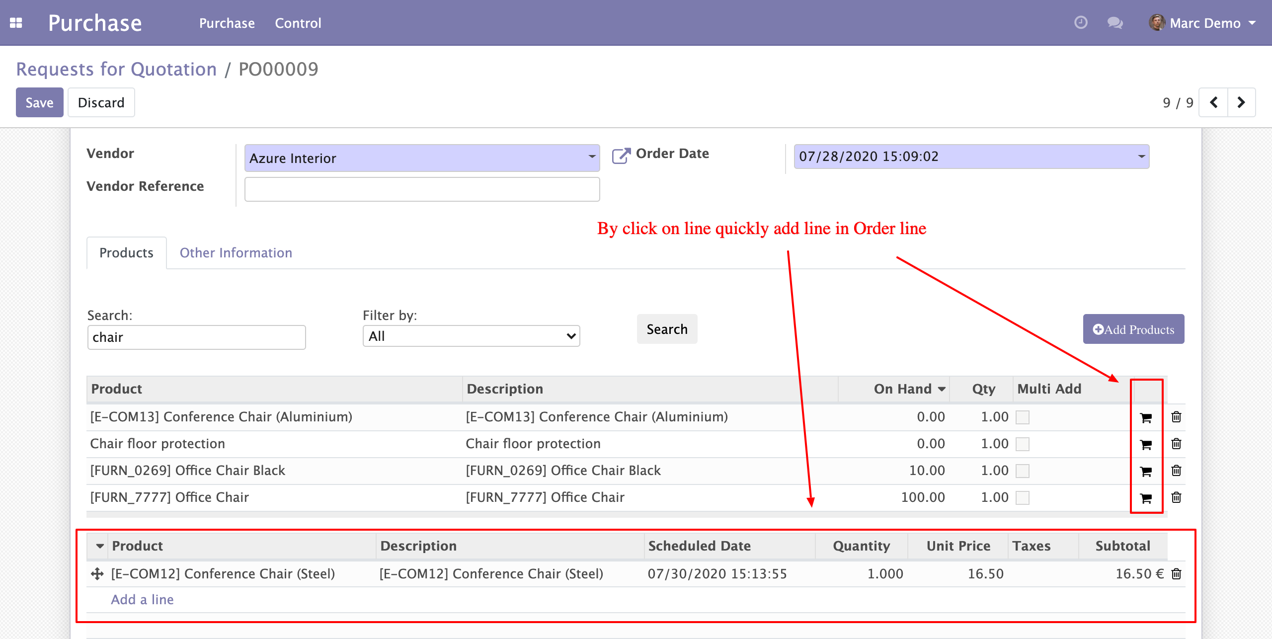 - Allow user to add product directly in purchase order line one by one or multi add by selecting item.