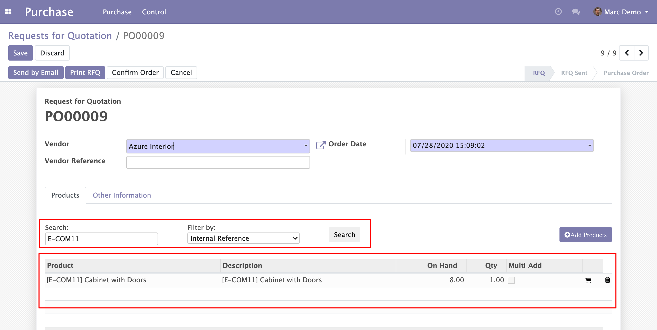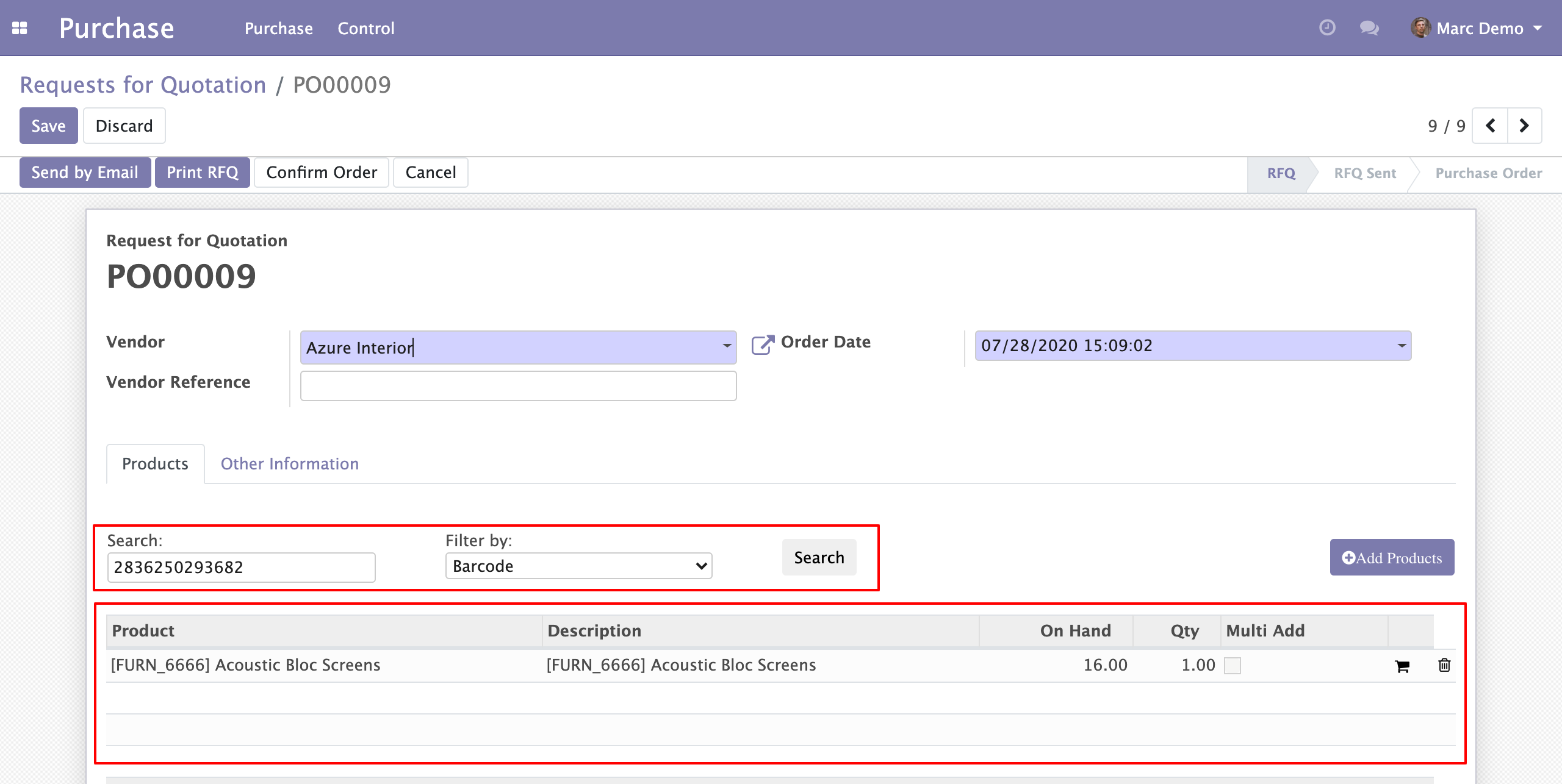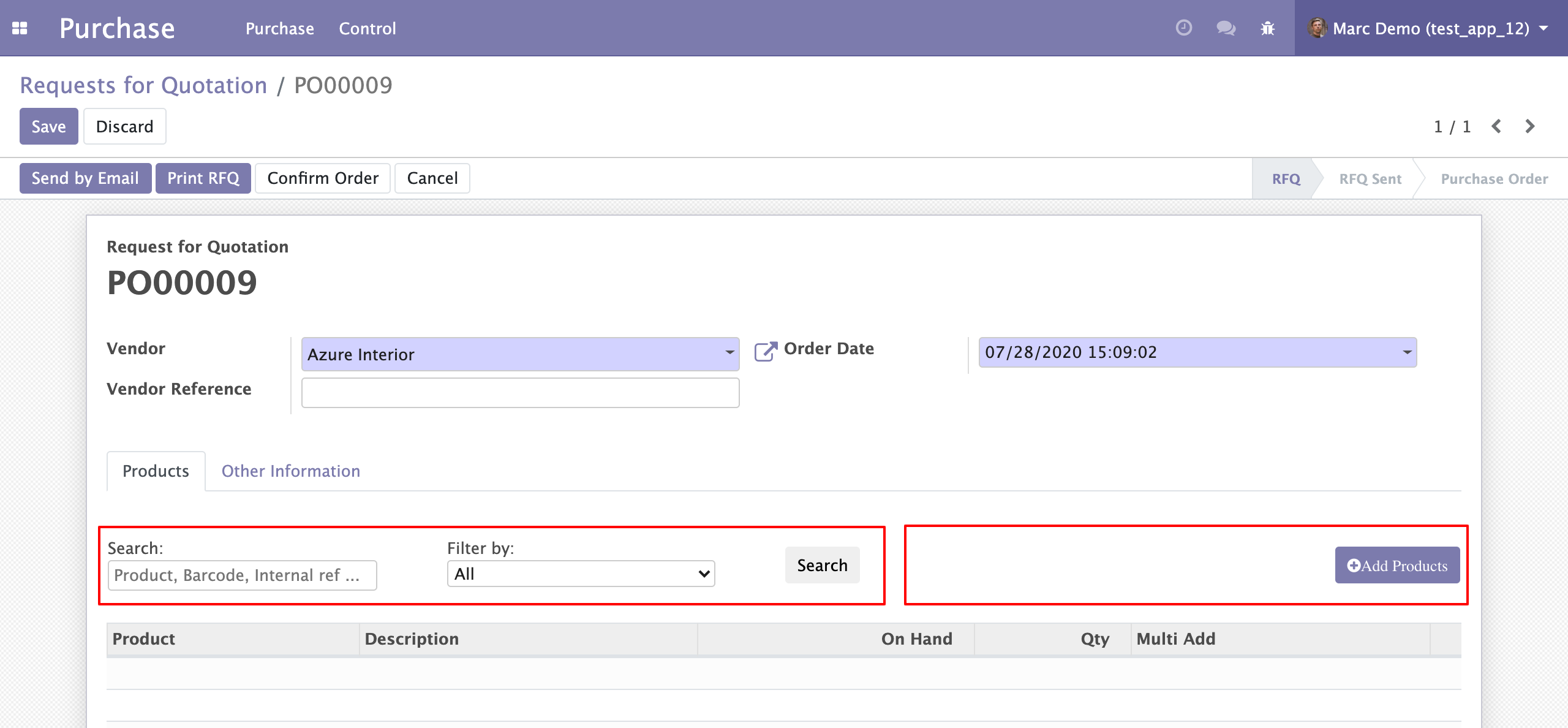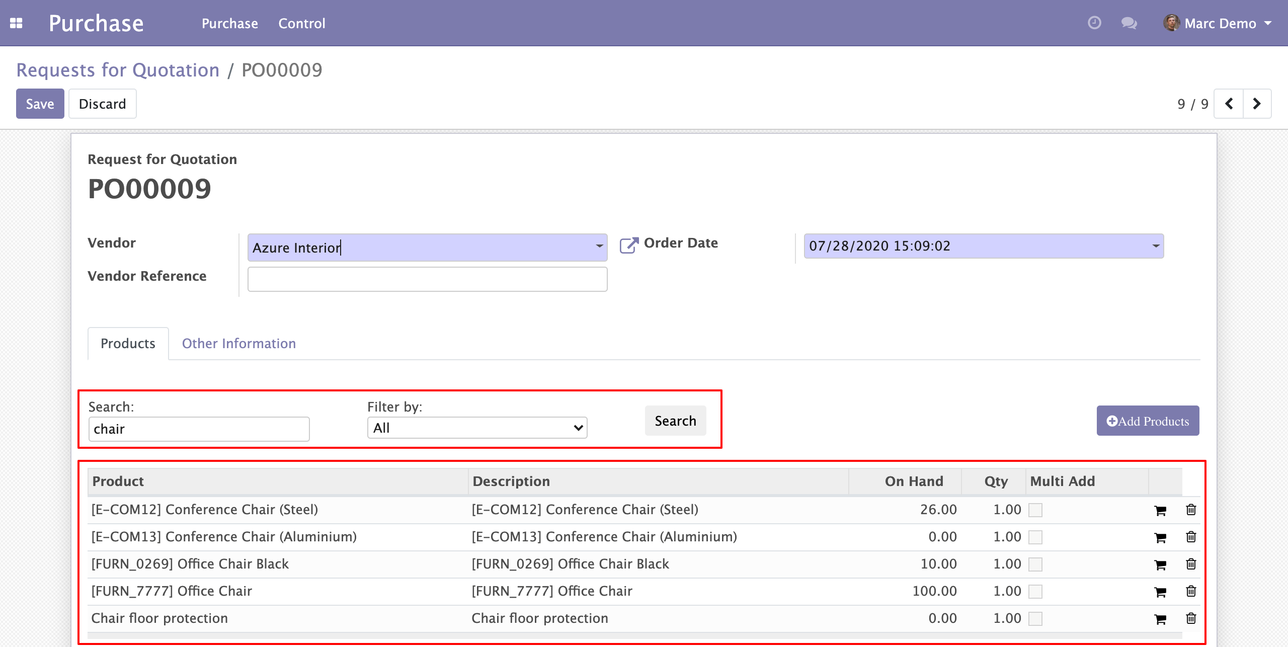 - Allow user to add product directly in purchase order line one by one or multi add by selecting item.