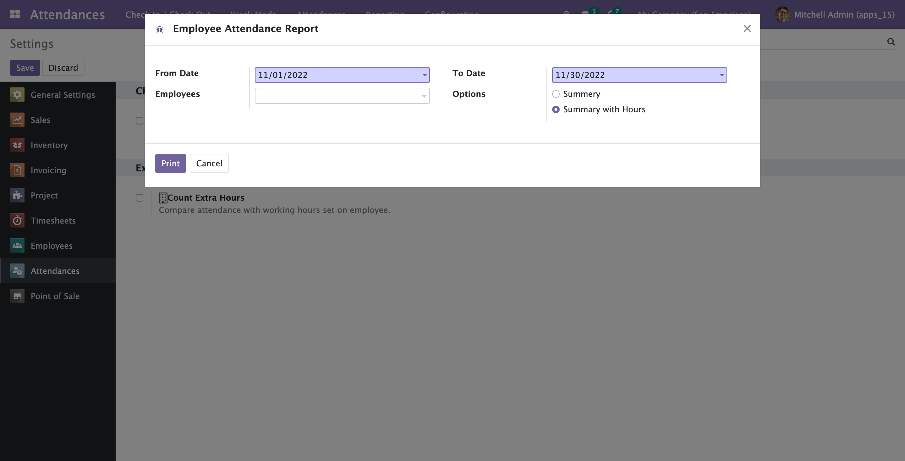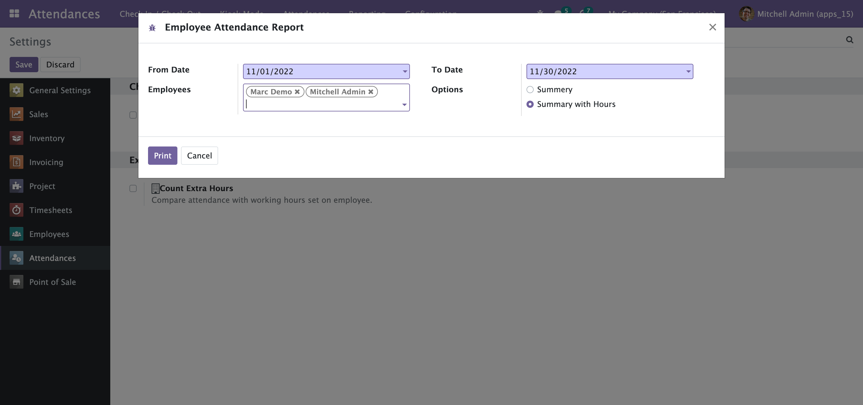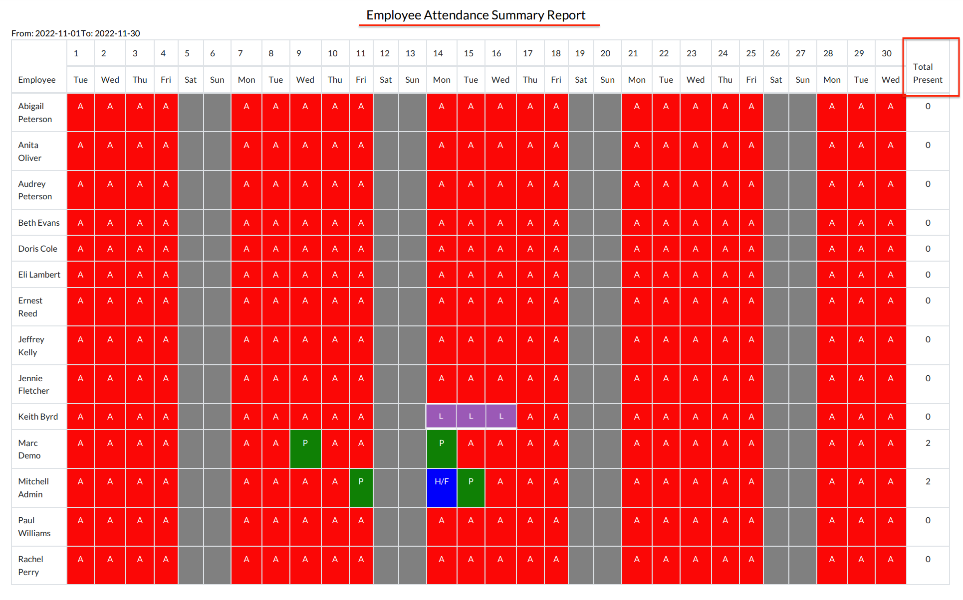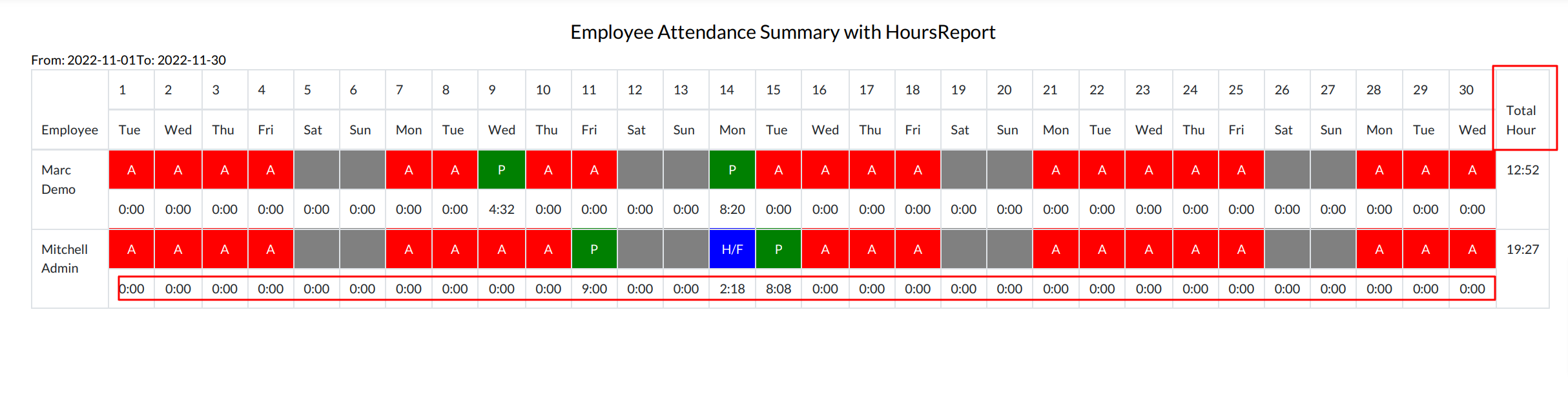 - Employee Attendance Report includes status summery line ( A - Absent, P - Present, H/F - Half Day, L - Leave) as well as with hours Summery (Attendance Hours of that day).