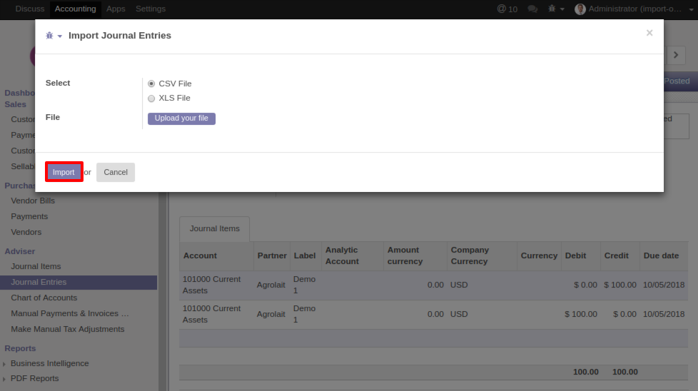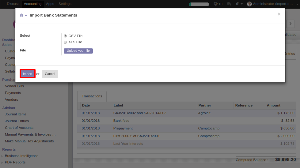 - Import Product, Customer/Vendor, Sales Order, Purchase Order, Customer Invoice/ Vendor Bill, Stock, Picking, bank Statement, Journal Items, Customer/Supplier Payment.