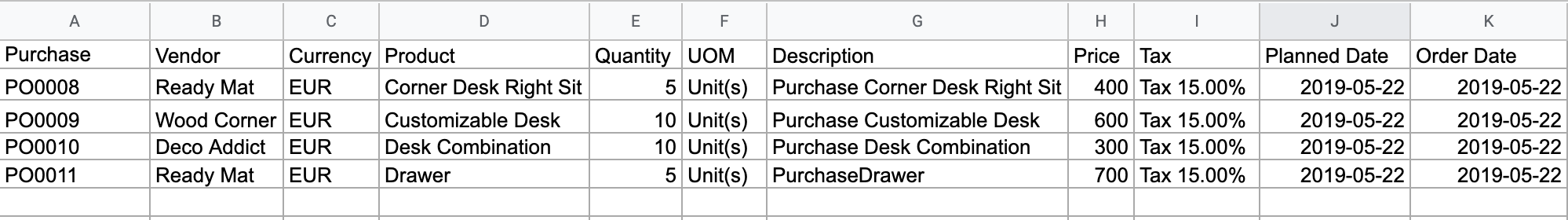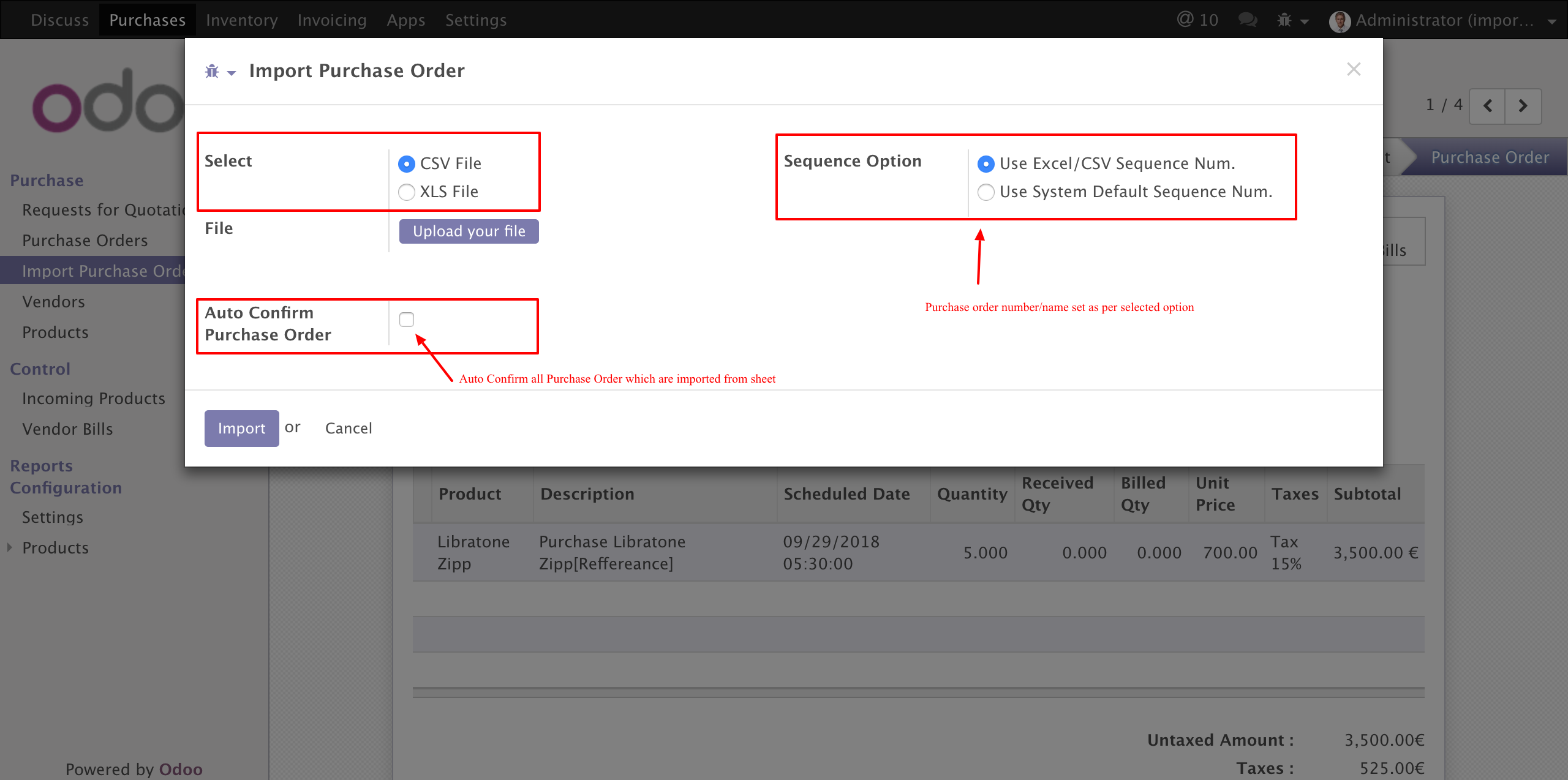 • The purchase order is in draft stage and Sequance(purchase Order number) is same as we given in CSV/XLS file.