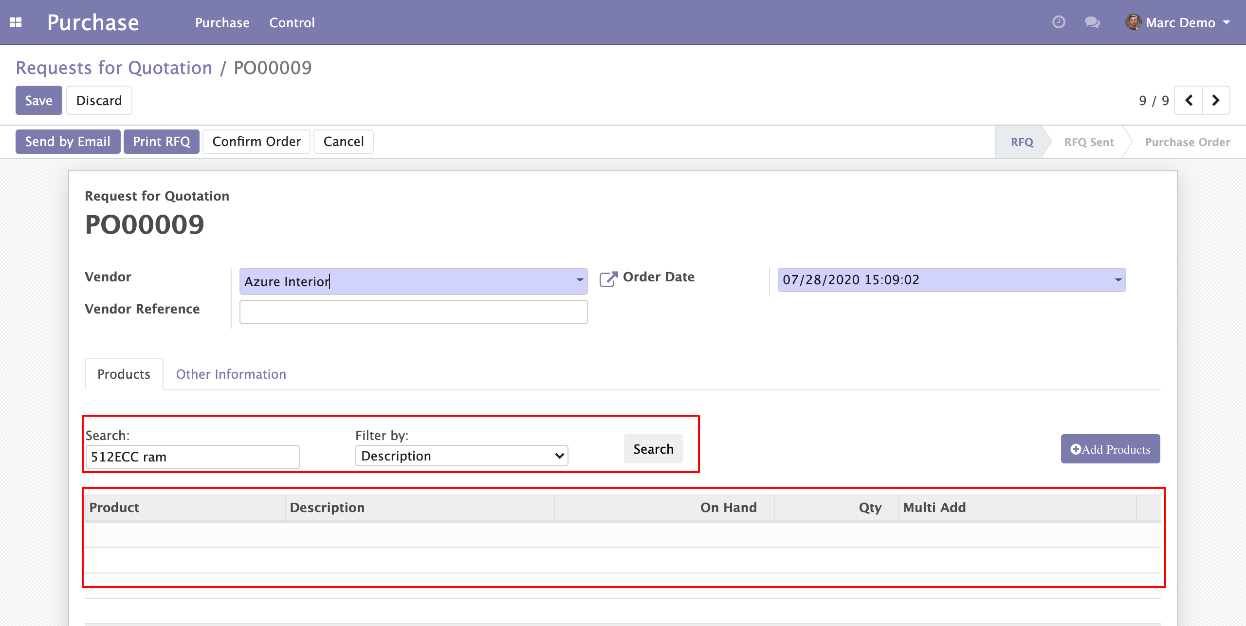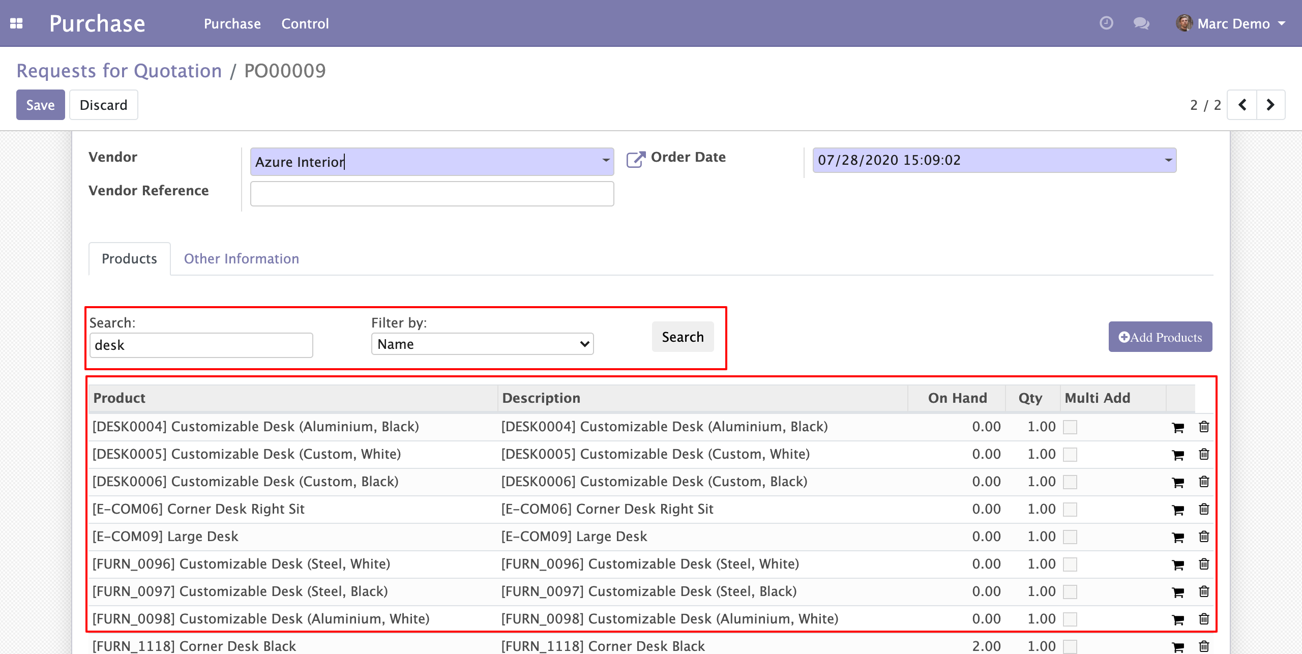 - Allow user to add product directly in purchase order line one by one or multi add by selecting item.